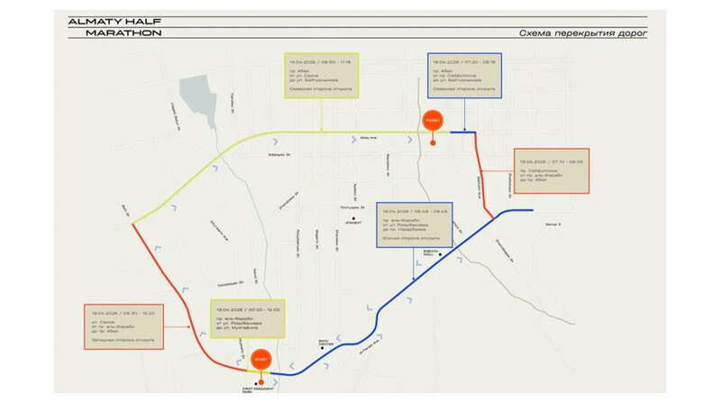 Для проезда к месту старта организаторы рекомендуют использовать улицы Мустафина, Навои, Садыкова, Дулати, Саина и Розыбакиева с выездом на проспект аль-Фараби. В связи с ожидаемой загруженностью дорог участникам советуют добираться до старта на общественном транспорте - до пересечения проспекта аль-Фараби и улицы Мустафина.